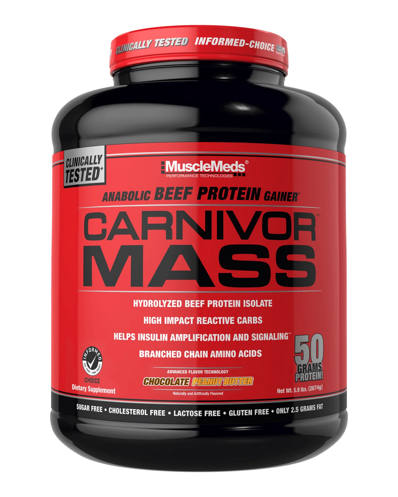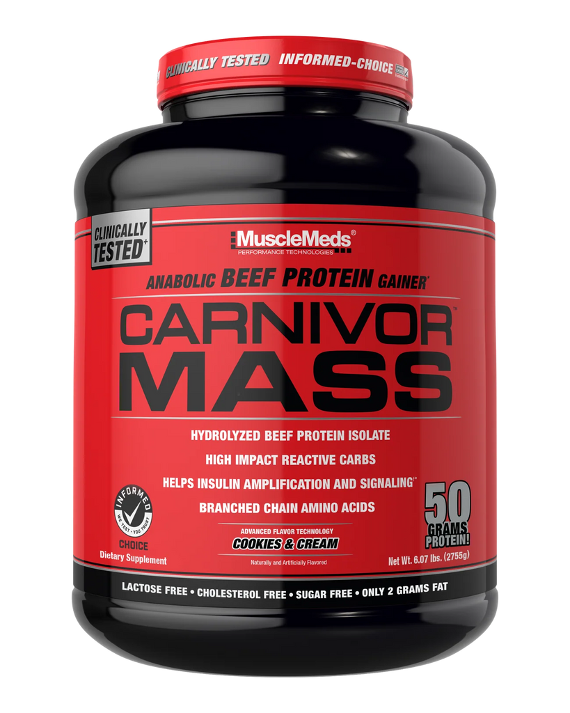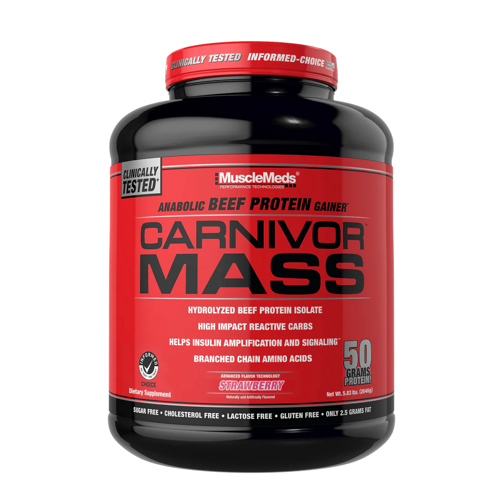 Musclemeds Carnivor Mass 6 lbs is called by some an anabolic superfood� and is more advanced than the typical mass gainer. Where regular foods and typical gainers may be limited in terms of speed of absorption and the potential for insulin spiking, CARNIVOR MASS excels. It combines pure hydrolyzed beef protein isolate (BPI) with a dual-action insulin signal amplifying technology known as iSpike. BPI and iSpike act in tandem to support improved muscle anabolism while minimizing fat storage. CARNIVOR MASS is a fast, clean and highly anabolic gainer. Mass gainers are mostly about calories and calorie surplus. Calorie surplus leads to mass or weight gain, and a mass gainer helps create the calorie surplus.